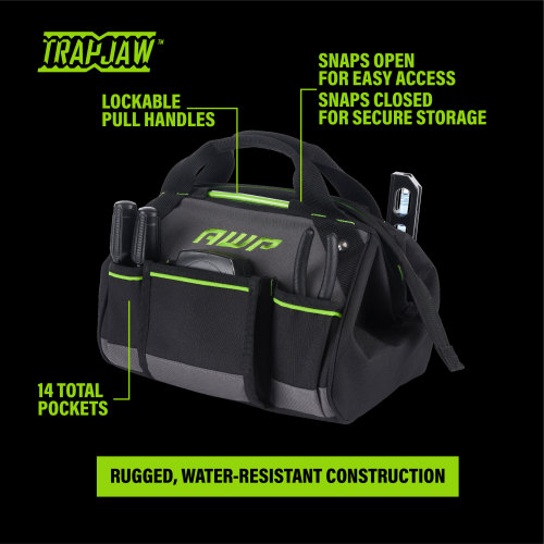 - PREMIUM TOOL BAG: Bring the shop to the jobsite with our exclusive TrapJaw™ Tool Bag; featuring our patented spring-hinge design, this bag snaps wide open for quick one-handed tool access or easily snaps closed to prevent spillage